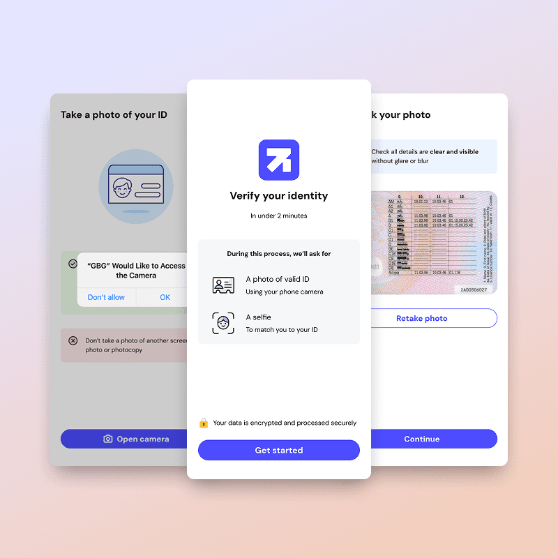 Mobile and web app UI design focused on trust, usability, and conversion, supporting secure identity verification flows across regulated and high-risk environments.
